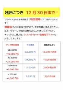 プリカ割引を延長します!!By MAKOTO_staff / 2025年12月1日 おはようございます!まこと鍼灸整骨院あけぼの院です😉好評につき、プリペイドカードの割引を12月まで延長します♪無期限で利用できますので是非チャージをおすすめします!!体が冷えるこの季節、より一層メンテナンスを心掛けて行きましょう👍