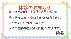10月22日(水)は院内研修のため、休診となります。