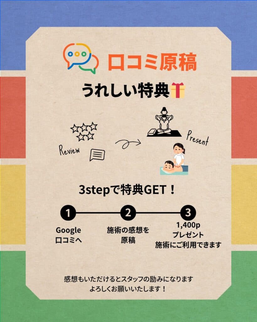 \口コミでうれしい特典🎁/ いつもご来院ありがとうございます😊 当院では、 Google口コミのご投稿で 【施術に使える1,400円分】をプレゼント✨ ▼かんたん3STEP ① Googleで口コミ投稿 ②