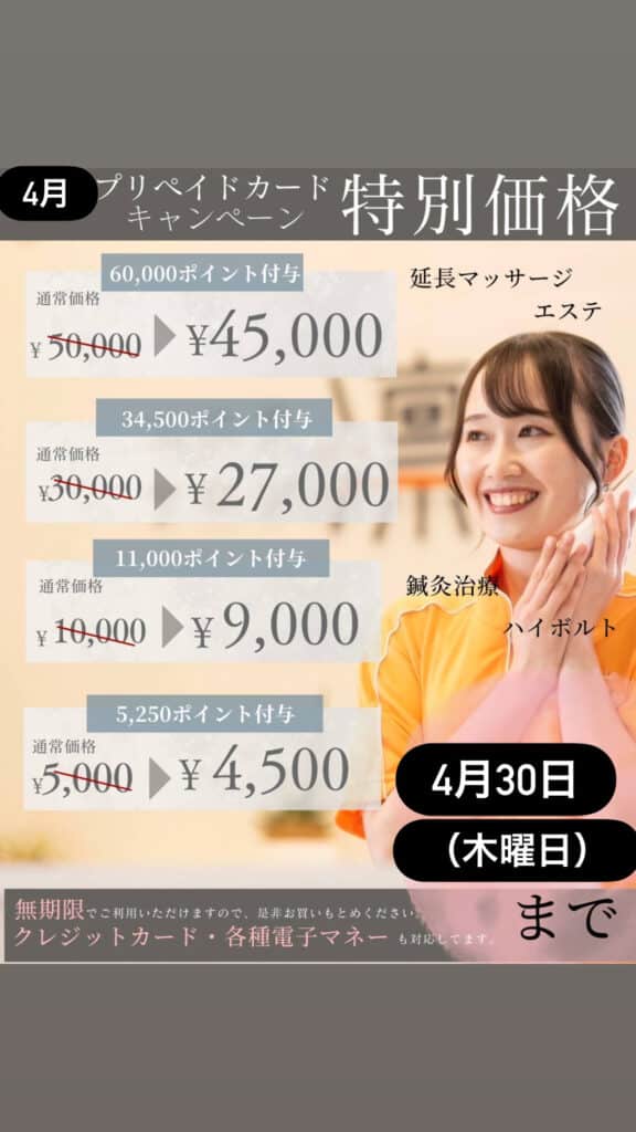 おはようございます! プリペイドカードのチャージはお済みですか? キャンペーンを引き続き実施中です! 本キャンペーンは4月30日までとなりますので、今月中のチャージをお勧めします! マッサージやエステなど、お体のメンテナ […]