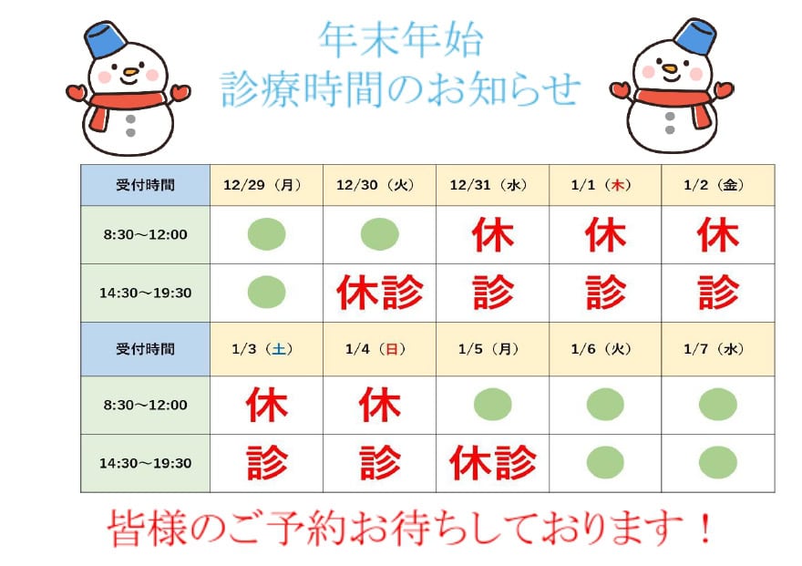 こんにちは! まこと鍼灸整骨院あけぼの院です😊 💫年末年始のお知らせ💫 今年の年末年始は、12/30(火)午後〜1/4(日)まで休診となります。 また、1/5(月)は社内研修の為、午前診療となりますのでご了承ください。