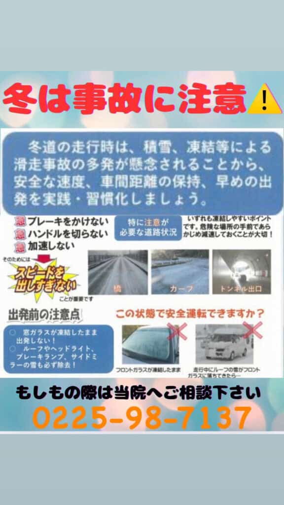 おはようございます☀ まこと鍼灸整骨院あけぼの院です! 本格的に冬が始まりそうですが、みなさんタイヤ交換はお済みですか?? 冬時期は路面の凍結によりスリップ事故が増えます⚠️ スピードを出しすぎないように心がけましょう!