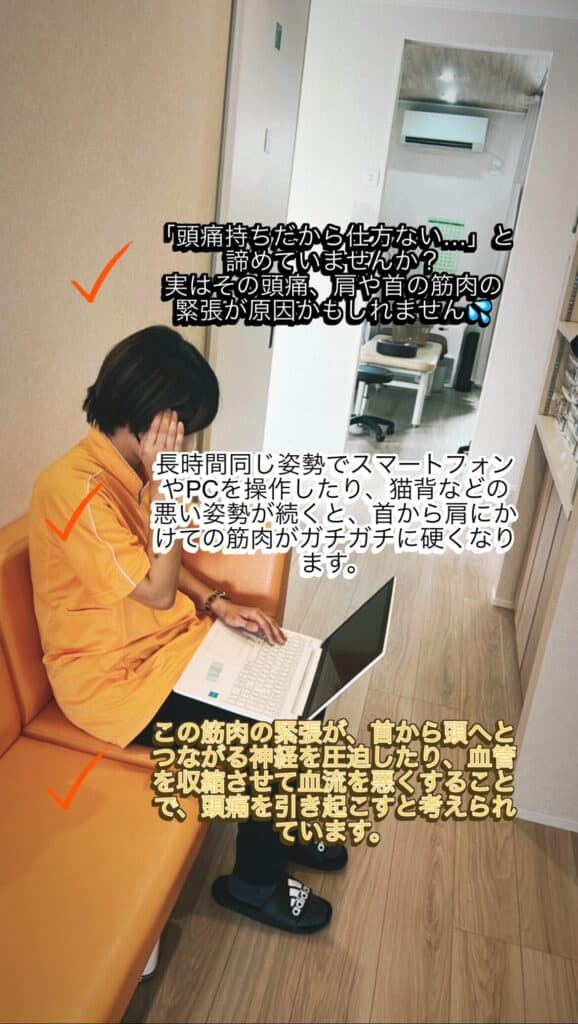こんにちは! まこと鍼灸整骨院あけぼの院です 肩こりや姿勢不良が原因として頭痛がすることがあります😢😢 これは、緊張した筋肉が神経を圧迫したり、血流を悪くしたりするためです🤦♂️ 当院では頭痛の原因を検査してマッサージ