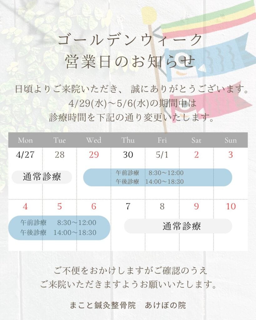 こんにちは! まこと鍼灸整骨院あけぼの院です✨ お出かけの予定も増えるゴールデンウイーク、皆様どうお過ごしの予定でしょうか🌞 連休中も皆様の「体のメンテナンス」をお手伝いできるよう、以下の日程で診療を行います! 4/29 […]
